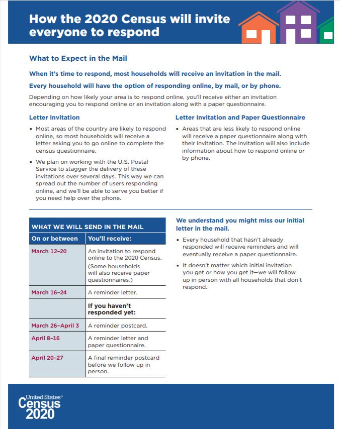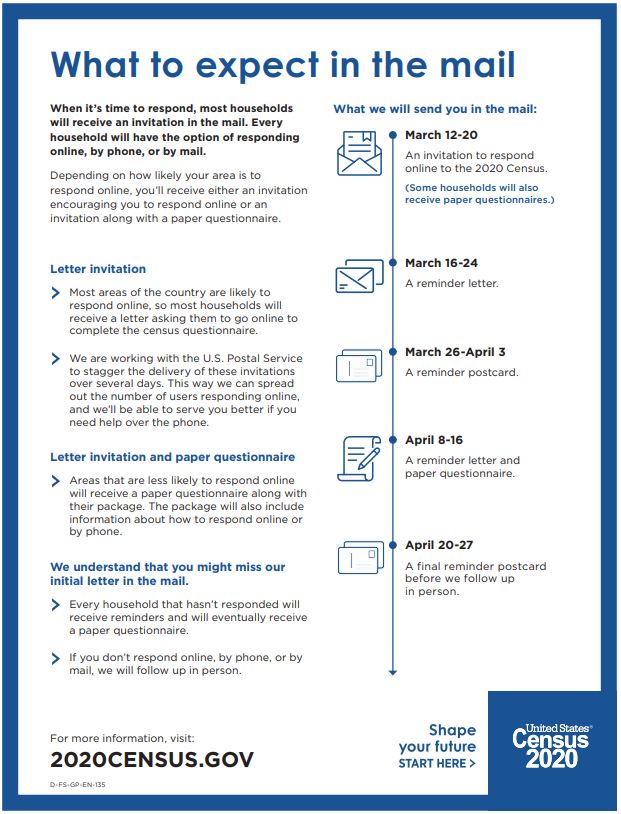 March 6 2020 ninety five percent or about 143 million households in the country will receive an initial invitation to respond to the 2020 census in their mailboxes between march 12 and 20the us. Areas less likely to respond online will receive a paper questionnaire with their invitation but can still choose to respond online.